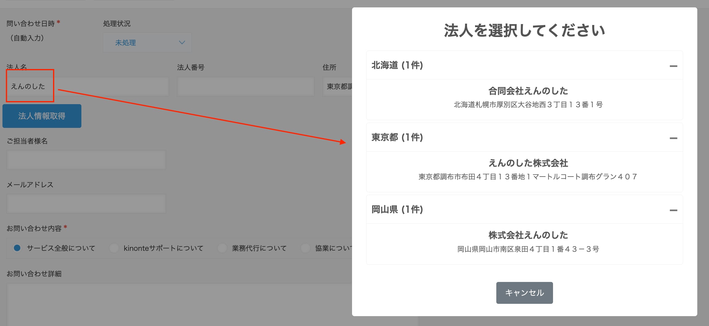 kintoneフィールドに入力した法人名や法人番号をもとに、gbizのデータベースから「法人名」「法人番号」「住所」を自動補完するプラグインです。常に正式な情報で取得できるので表記揺れの心配がなくなりますね。